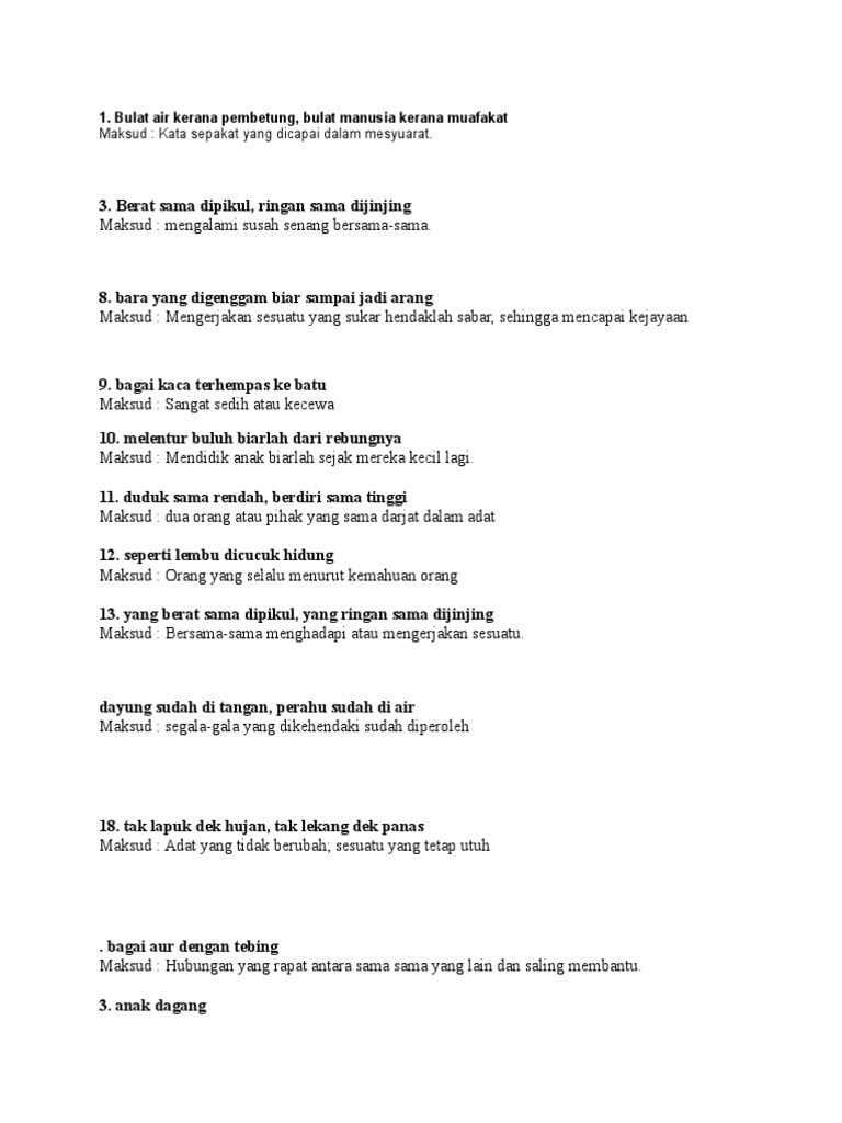 Setiap ahli mesyuarat kampung bersetuju dengan cadangan ketua kampung untuk membina surau di kampung itu bak kata pepatah, bulat air kerana pembentung. Kata sepakat yang dicapai dalam mesyuarat. Dibuat kerana allah, menjadi murka allah. Genggam bara api biar sampai jadi arang. Bulat air kerana pembetung bulat kata. Duduk sama rendah, berdiri sama tinggi. Ke bukit sama didaki, ke lurah sama dituruni 4. Bernasib malang kerana setelah memperoleh sesuatu, tetapi yang sudah di tangan hilang pula. Bak cendawan tumbuh selepas hujan maksud : Senarai peribahasa dalam buku teks tingkatan 4. Bulat air kerana pembetung, bulat manusia kerana muafakat. Tinggi gunung, tinggi lagi harapan kami. Bulat air kerana pembetung, bulat kata kerana muafakat 3.