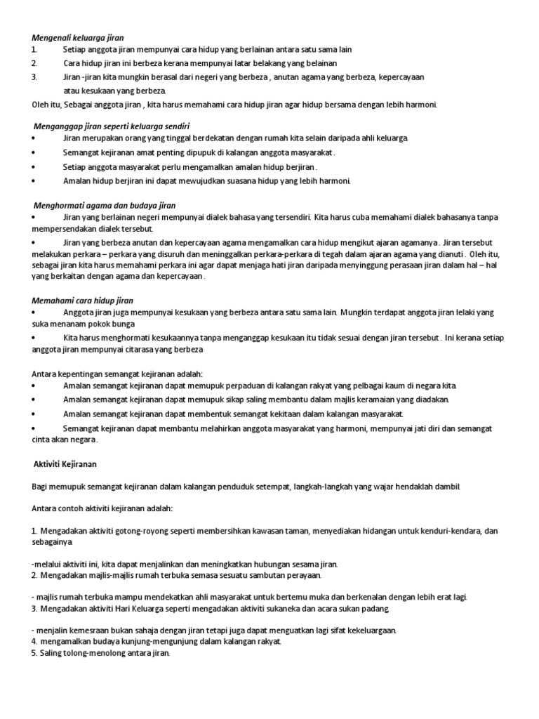 Berdasarkan perbincangan di atas, dapat saya simpulkan bahawa semangat kejiranan dalam setiap individu amat penting untuk melahirkan masyarakat yang penyayang dan membentuk perpaduan kaum. Semangat kejiranan dalam kalangan masyarakat hari ini dikatakan kian luntur. Melalui cara ini, setiap ahli keluarga dapat menjalinkan hubungan mesra sesama jiran. 3.2 masyarakat harus meningkatkan keselamatan kawasan tersebut untuk. Melalui cara ini, setiap ahli keluarga dapat menjalinkan hubungan mesra sesama jiran.